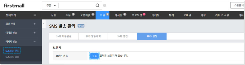 경로 : 관리자페이지 > 회원 > 메시지 발송 > SMS 발송 관리 > SMS 설정