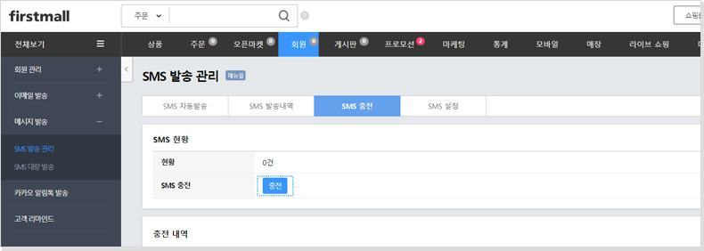 경로 : 관리자페이지 > 회원 > 메시지 발송 > SMS 발송 관리 > SMS 충전